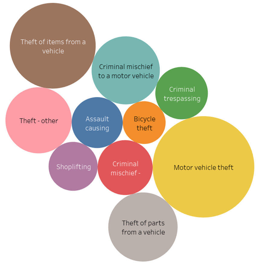 This shows the top 10 most common types of crime in the city. The bigger the circle, the more often it happens. Do you notice any trends? Theft is a common theme.