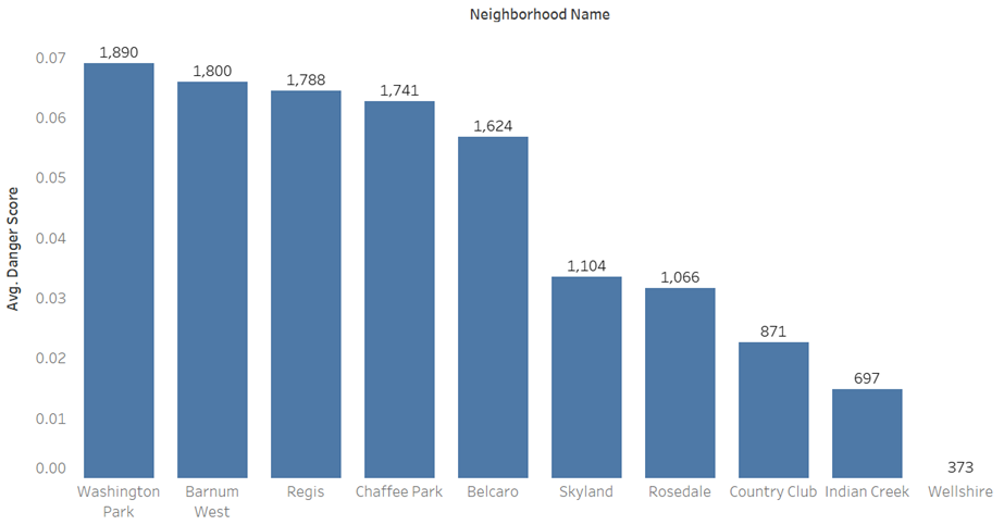What are we looking at here? This is a map of all neighborhoods in Denver, with the darker colors reflecting a higher “danger score.” That is a derivation I created which is simply a composite score of crime frequency and the number of victims per crime in a given area over the 5 years.